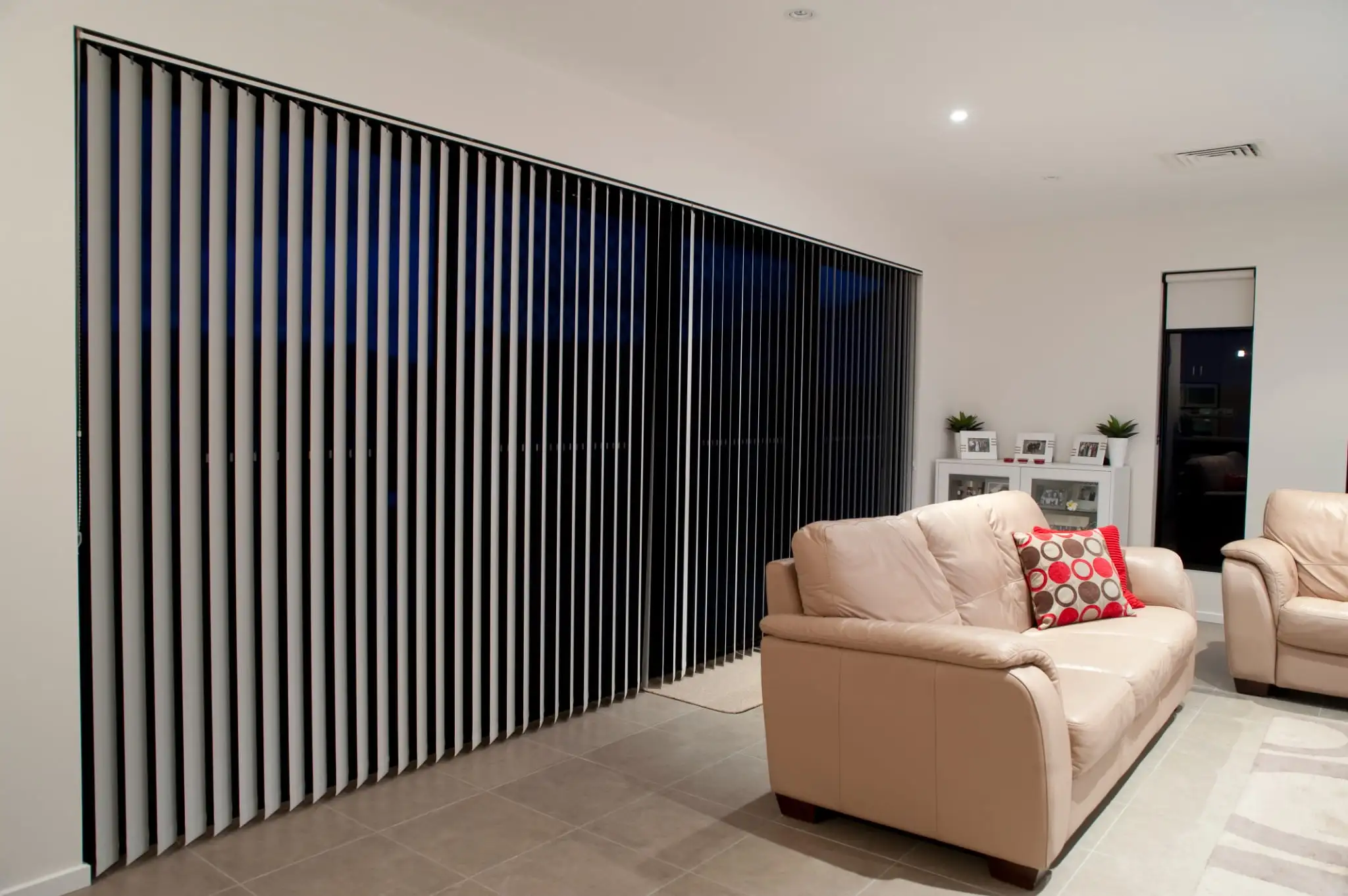 Vertical blinds are built for wide openings. Where other window coverings struggle (sliding doors, stacker doors, floor to ceiling windows), verticals handle it without a second thought. The louvres rotate to control light and privacy, and stack neatly to one or both sides when open.