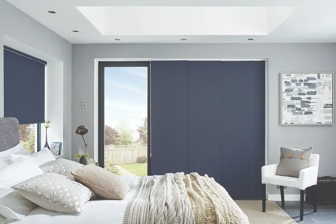 Panel glides are the modern alternative to vertical blinds. Instead of individual louvres, wide fabric panels hang from a track and glide across to stack neatly at one or both ends. The result is a smooth, uninterrupted look that suits contemporary interiors beautifully.